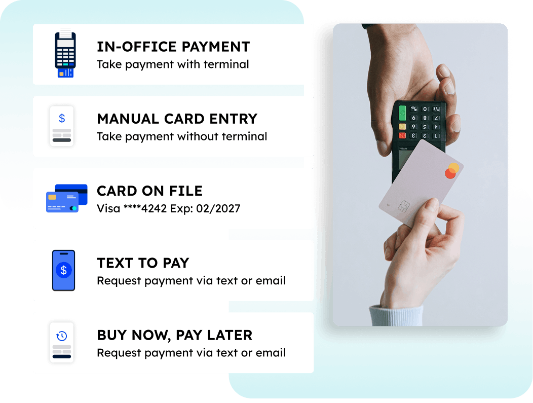 Accept in-office payments, card-on-file charges, or payments via text and email.